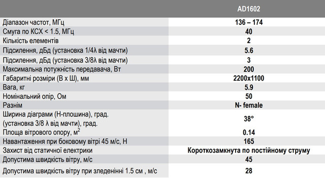 HORWIN AD1602 – широкосмугова 2-х елементна УКХ антена з дипольним елементом типу «петльовий вібратор». Всі елементи конструкції короткозамкнуті по постійному струму. Елементи антени виготовлені з алюмінієвого сплаву та покриті полімерним захисним покриттям. Щогла (трубостійка) не входить до комплекту антени.